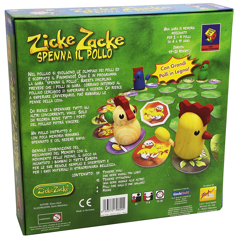 I più piccoli si divertiranno molto a correre nel pollaio! In questo gioco sono galli e galline che devono affrontare una corsa: nell’aia c’è un po’ di competizione! Dovranno superare tutti gli altri pennuti per potergli così portare via le penne dalla coda. Infatti lo scopo del gioco è proprio riuscire a “spennare” tutti gli altri polli. Zicke Zacke – Spenna il pollo è un gioco che combina il meccanismo dei giochi memory con quello del tabellone e dello spostamento delle pedine. Per poter muovere le proprie pedine i concorrenti dovranno ricordare le tessere coperte che hanno potuto osservare solo per poco tempo. Semplice e veloce gioco dalle regole immediate e corredato di pezzi in legno e di qualità grafica eccellente!